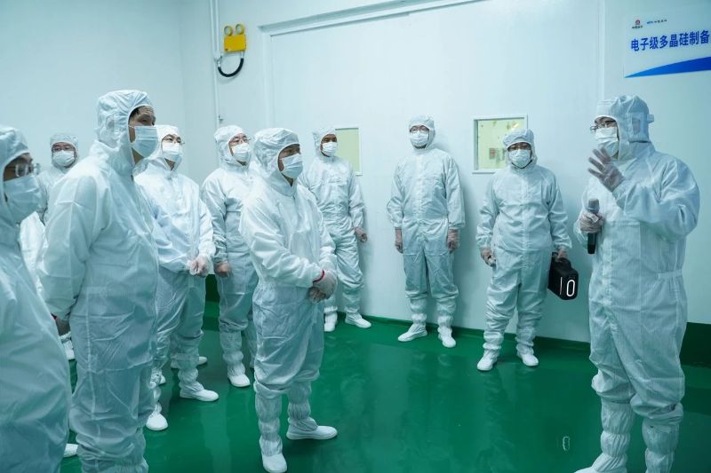 在洛龍廠區(qū),翁祖亮認真聽取中硅高科硅基材料技術譜系研發(fā)、設計情況匯報,參觀了硅基材料制備技術國家工程研究中心等實驗室及中試車間,深入了解中硅高科從機理研究到小試再到中試和產(chǎn)業(yè)化的科技創(chuàng)新體系。在孟津新廠區(qū),翁祖亮參觀了展廳,實地考察了控制指揮中心、分析測試中心及區(qū)熔級多晶硅、電子氣體生產(chǎn)線,詳細詢問了智能化工廠建設、大數(shù)據(jù)平臺運行、二期產(chǎn)業(yè)化情況等。